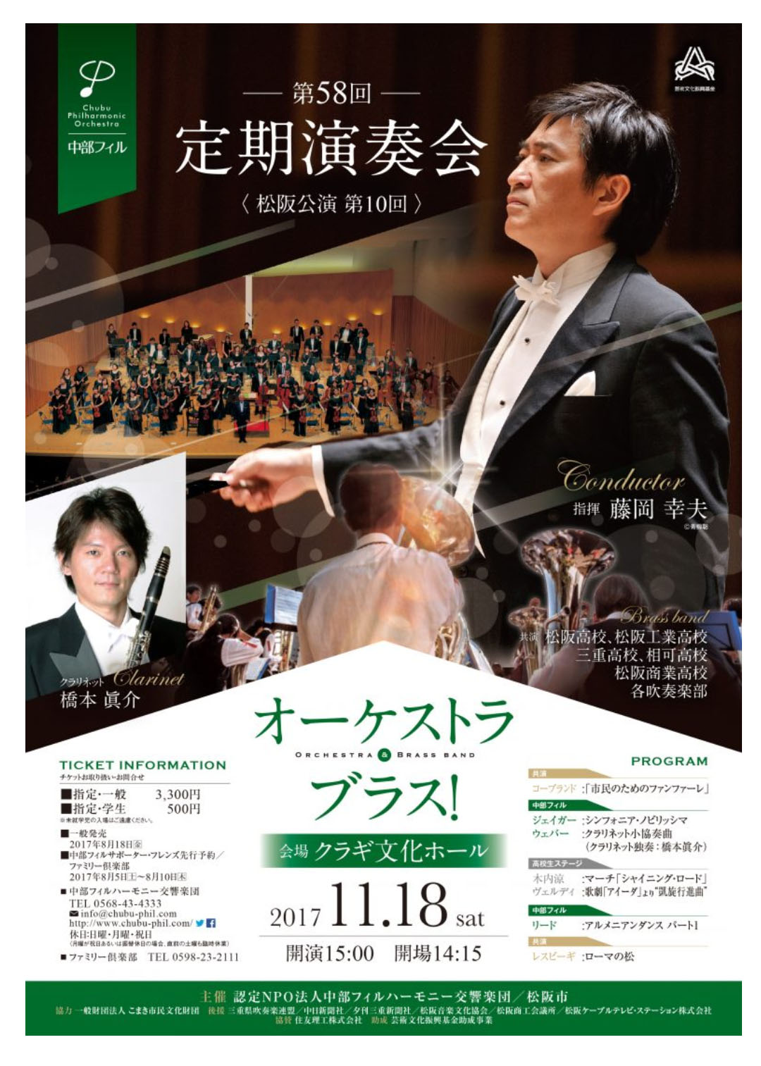 | 2917/11/19 11月20日(月曜)のエンター・ザ・ミュージックのゲストはシンガー・ヴァイオリニスト・作詞作曲家のサラ・オレインさん。ノンヴィブラートを効果的に入れた歌唱がとっても素敵でした。楽しいトークもお届けいたします。 ![]() 18日は三重県松阪のクラギ文化ホールで中部フィルの定期演奏会。 中部フィルとは初共演だったけど生き生きとしたサウンドでレスポンス抜群。皆さん明るい。メインのローマの松もとっても色彩豊かだった。 そしてウェーバーのクラリネット小協奏曲で共演した橋本眞介さんとは久しぶりの再会で嬉しかったしとっても素敵でした。 愛知県の小牧市をベースにしたオケで定期演奏会は中部地方各地で開催するという個性的なスタイル。素晴らしい文化と感激しました。 地元松阪の5つの高校の吹奏楽部との共演もみんな元気で良かった! とっても楽しい演奏会でした。ありがとうございました! ![]() 松阪高校 松阪工業高校 三重高校 相可高校 松阪商業高校 吹奏楽部の皆さん。この合同オケとはシャイニング・ロードとアイーダの凱旋行進曲で共演 楽しかった! ![]() アンコールで中部フィルとの共演で星条旗よ永遠なれのリハーサル。 松阪工業高校の男子のエブリバディと。青春!って感じでした(^-^) 各校の音楽指導の先生方。皆さん仲が良く素晴らしいチームワーク! 向かって左から三重高校 川北浩史先生、松阪工業高校 齋田 努先生、相可高校 西田優樹先生、 松阪高校 中山明之先生 ありがとうございました! 本番前夜は美味しい松阪牛で宴会!盛り上がって楽しかった~! 向かって僕の右は中部フィルの大野英人専務理事・事務局長。左はステージマネージャーの吉田敬一さん。 さてさて20日は東京交響楽団&JR大人の休日倶楽部合唱団(おときゅう合唱団)と第九です。楽しみ! それでは皆さんコンサートとエンター・ザ・ミュージックでお会いしましょう! 藤岡 幸夫 |