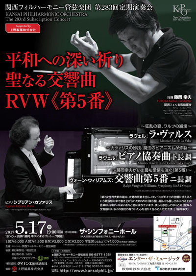 〜狂乱の宴、ワルツの崩壊〜 ●ラヴェル:ラ・ヴァルス 〜カツァリスの妙技、魔法のピアニズムが炸裂〜 ●ラヴェル:ピアノ協奏曲 ト長調 (アンコール)「フランス風即興曲」 〜藤岡幸夫がいま最も愛情を注ぐ《第5番〜 ●ヴォーン・ウィリアムズ:交響曲第5番 ニ長調 独奏:ピアノ:シプリアン・カツァリス(ピアノ) 管弦楽: 関西フィルハーモニー管弦楽団