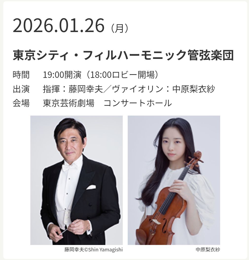 | 1/26 (月) | 都民芸術フェスティバル (東京シティフィル) ◆東京芸術劇場(東京都) ◆19:00開演 | JPG |