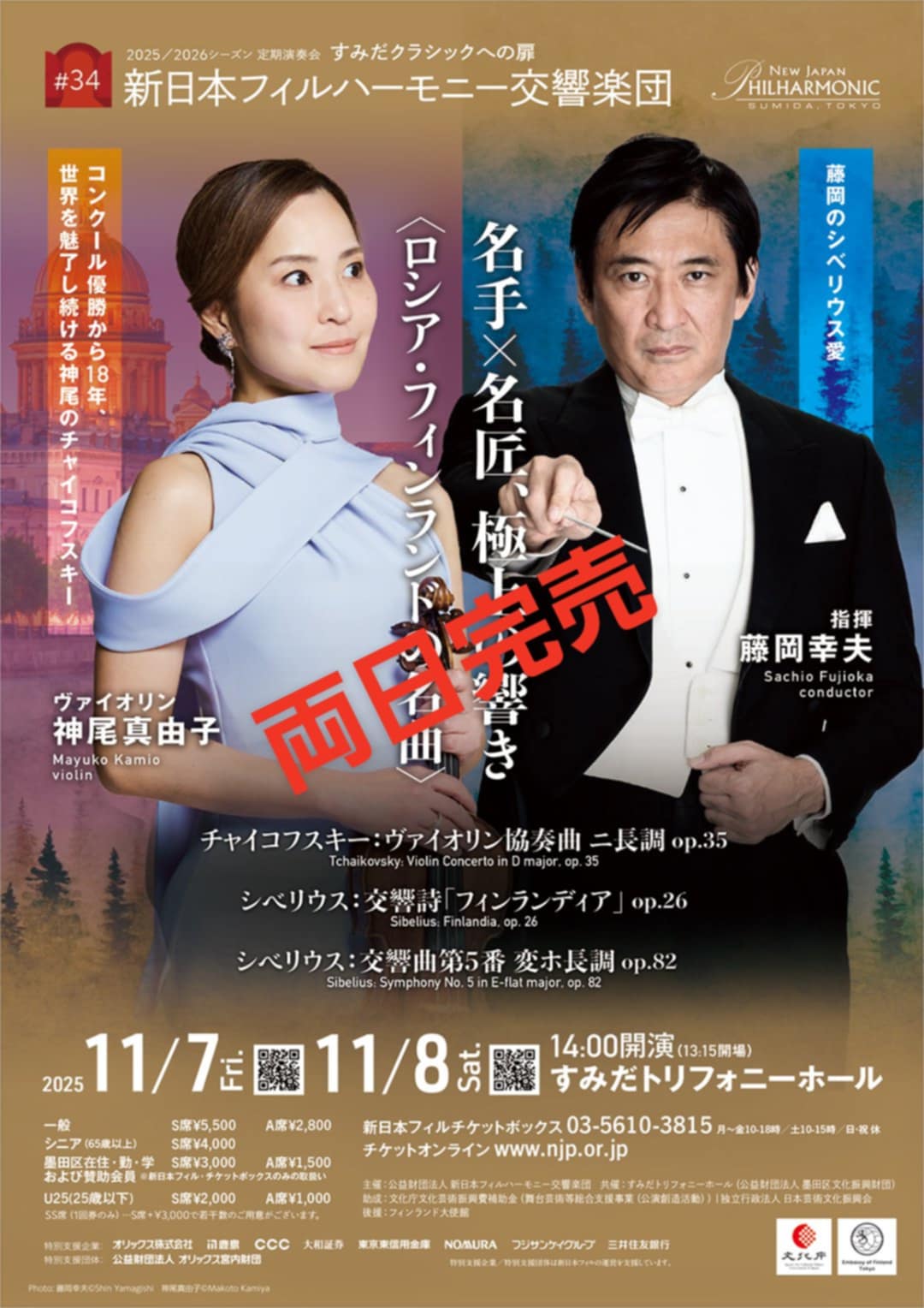 2025/10/26 皆さん お元気ですか?僕は大好きな金木犀の香りを楽しんでます。 3冊目のエッセイ「続々・音楽はお好きですか?」の入稿が終わりました。発売は11月中旬です。最初の2冊まだの方は是非! ↓ https://amzn.asia/d/61TKIL6 先週は古巣の日本フィルと横浜定期でした。 吉松隆さんのトロンボーン協奏曲も、シベリウスの交響曲1番もデビュー仕立ての頃に日本フィルとやったので懐かしかった。演奏会のレポートはのちほど。 シベリウスの交響曲第1番は12月に国立音楽大学の定期演奏会でまた取り上げるし、僕の愛する交響曲第5番は11月7&8日に新日本フィルと出来るので幸せです…!! 詳しくは文末のチラシコーナーを参照して下さいませ。 さてさて今年も大阪で藤岡幸夫のファンの皆様との集いがあります!何方でも気軽に参加できますので是非(^^) 11月1日(土) ホテル・ニューオータニ大阪 11時開宴 僕が司会のミニコンサートのゲストは 素晴らしいソプラノ(^^)安川みくさん!! 詳細&申し込みフォーム(締切は10月27日ですが、締切過ぎても申し込み可能です。問い合わせてみて下さい)↓ ttps://marvel-ex.com/s-fujioka-tudoukai/ その他、各地のオーケストラとたくさんコンサートがあります! 文中、文末のチラシコーナーを参照して下さいませ。 皆様のご来場をお待ちしております! エンターザミュージック(BSテレ東 毎週土曜日の朝8時半〜)は10月で放送12年目に突入!! 山本倖千恵アナと楽しくお届けします! ![]() 11月1日(土)は新井鷗子さんをゲストにサン・サーンスの交響曲第3番「オルガン付き」を山本倖千恵アナと楽しくお届け! ![]() 東京シティフィル(オルガン・石丸由佳さん)のエキサイティングな演奏をお届けいたします! 番組ホームページ (いいね!よろしくお願いいたします!) https://www.bs-tvtokyo.co.jp/enterthemusic/ X(旧Twitter)にエンター・ザ・ミュージックの公式アカウントが出来ました。このアカウントでしか見れない動画や収録時の様子などこれからどんどん紹介します!是非ともフォローをお願いいたしますm(_ _)m↓ https://x.com/ETM2014?t=BIPeAKlsLunrEbRFRB_fcg&s=09 《エッセイ集「続・音楽はお好きですか?」発売中!》 ![]() ![]() 前巻が好評で続編が発売されました!(2021/12/14) こちらからも買えます↓ Amazon 前巻まだな方は是非とも! ![]() 版元ドットコム Amazon 《シベリウス交響曲全集発売中!》 高評価を頂き在庫切れでしたが、再プレスで在庫復活しました!まだの方は是非! 関西フィルとのシベリウス交響曲全集&ヴァイオリン協奏曲!! 全曲新録音!CD4枚組BOXでなんと 5500円!! 22年目のシーズンを迎える関西フィルとの我々ならではの一体感溢れた演奏をお届け! コンサートマスターの岩谷祐之さんの協奏曲も素晴らしいです! ![]() ぶらあぼ ![]() 是非ともよろしくお願いいたします! タワーレコード Amazon ![]() 10月21日は関西フィルといずみホールで毎年恒例の夢チャリティコンサートでした。 毎年とても心温まる演奏会で、20年以上毎回指揮してるけど今年も楽しかった。 ウィーン楽友協会大ホールを模倣したいずみホールは、ヨハン・シュトラウスのワルツが美しい響いて気持ち良かった! 皆さんありがとうございました! ![]() 翌22日からは日本フィルと25日横浜定期のリハーサル。 前半の吉松隆さんのトロンボーン協奏曲のソロの日本フィル首席奏者の伊藤雄太さん! 素晴らしいテクニック! ![]() メインはシベリウスの交響曲第1番でオケは激アツ! ![]() コンサートマスターは素晴らしいリードの田野倉雅秋さん! ![]() 前半トロンボーン協奏曲の伊藤雄太さんは若々しく爽やかで素敵なソロ(^^) 吉松隆さんもご満悦でした! ![]() 金管セクションの皆さんと! ![]() シベリウスの交響曲第1番は日本フィルらしい豪快なサウンドで熱かった!! リハーサルからとっても楽しかったです。 皆さんありがとうございました\(^-^)/ シベリウス1番は12月に国立音大の定期演奏会でもやります!! ![]() この横浜定期のゲネプロにウィーンフィルの和樹・ヘーデンボルグ君が遊びに来てくれました(^^)来年1月に日本フィルを弾き振りします!! 和樹くん他ウィーンフィルのメンバーが関西フィルのオケ中に入っての定期は20年前で懐かしかった〜! ↓ 2005年10月21日 ザ・シンフォニーホール(大阪市) 指揮/藤岡幸夫 (楽団正指揮者) コンサートマスター/ギオルギ・バブアゼ) モーツァルト/ピアノ協奏曲第6番 ピアノ独奏/ジャスミンカ・スタンチュール モーツァルト/協奏交響曲 K.364 ヴァイオリン独奏/ヴェルナー・ヒンク ヴィオラ独奏/ハンス・ペーター・オクセンホファー ブラームス/交響曲第1番 コンサートマスター/ヴェルナー・ヒンク 第2ヴァイオリン首席/ヴィルフリード・和樹・ヘーデンボルグ ヴィオラ首席/ハンス・ペーター・オクセンホファー チェロ首席/フリッツ・ドレシャル コントラバス首席/ミヒャエル・ブラデラー" ![]() このコンサート後に飲みに行った。 左がウィーンフィルコンサートマスターのヒンクさん。右が首席チェロのドレシャルさん。それにヴィオラのオクセンホファーさんは僕が中