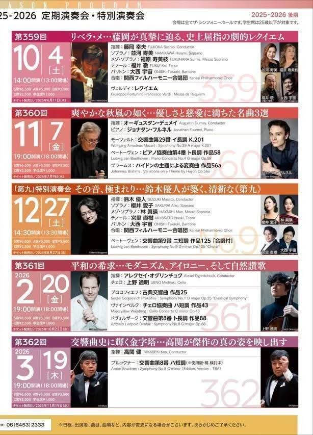 | 2025/10/26 皆さん お元気ですか?僕は大好きな金木犀の香りを楽しんでます。 3冊目のエッセイ「続々・音楽はお好きですか?」の入稿が終わりました。 発売は11月21日です。 https://amzn.asia/d/alnhkvU ![]() 最初の2冊まだの方は是非! ↓ https://amzn.asia/d/61TKIL6 先週は古巣の日本フィルと横浜定期でした。 吉松隆さんのトロンボーン協奏曲も、シベリウスの交響曲1番もデビュー仕立ての頃に日本フィルとやったので懐かしかった。演奏会のレポートはのちほど。 シベリウスの交響曲第1番は12月に国立音楽大学の定期演奏会でまた取り上げるし、僕の愛する交響曲第5番は11月7&8日に新日本フィルと出来るので幸せです…!! 詳しくは文末のチラシコーナーを参照して下さいませ。 さてさて今年も大阪で藤岡幸夫のファンの皆様との集いがあります!何方でも気軽に参加できますので是非(^^) 11月1日(土) ホテル・ニューオータニ大阪 11時開宴 僕が司会のミニコンサートのゲストは 素晴らしいソプラノ(^^)安川みくさん!! 今年も大阪で藤岡幸夫のファンの皆様との集いがあります❗️何方でも気軽に参加できますので是非🥰 ![]() その他、各地のオーケストラとたくさんコンサートがあります! 文中、文末のチラシコーナーを参照して下さいませ。 皆様のご来場をお待ちしております! エンターザミュージック(BSテレ東 毎週土曜日の朝8時半〜)は10月で放送12年目に突入!! 山本倖千恵アナと楽しくお届けします! ![]() 11月1日(土)は新井鷗子さんをゲストにサン・サーンスの交響曲第3番「オルガン付き」を山本倖千恵アナと楽しくお届け! ![]() 東京シティフィル(オルガン・石丸由佳さん)のエキサイティングな演奏をお届けいたします! 番組ホームページ (いいね!よろしくお願いいたします!) https://www.bs-tvtokyo.co.jp/enterthemusic/ X(旧Twitter)にエンター・ザ・ミュージックの公式アカウントが出来ました。このアカウントでしか見れない動画や収録時の様子などこれからどんどん紹介します!是非ともフォローをお願いいたしますm(_ _)m↓ https://x.com/ETM2014?t=BIPeAKlsLunrEbRFRB_fcg&s=09 ![]() 10月21日は関西フィルといずみホールで毎年恒例の夢チャリティコンサートでした。 毎年とても心温まる演奏会で、20年以上毎回指揮してるけど今年も楽しかった。 ウィーン楽友協会大ホールを模倣したいずみホールは、ヨハン・シュトラウスのワルツが美しい響いて気持ち良かった! 皆さんありがとうございました! ![]() 翌22日からは日本フィルと25日横浜定期のリハーサル。 前半の吉松隆さんのトロンボーン協奏曲のソロの日本フィル首席奏者の伊藤雄太さん! 素晴らしいテクニック! ![]() メインはシベリウスの交響曲第1番でオケは激アツ! ![]() コンサートマスターは素晴らしいリードの田野倉雅秋さん! ![]() 前半トロンボーン協奏曲の伊藤雄太さんは若々しく爽やかで素敵なソロ(^^) 吉松隆さんもご満悦でした! ![]() 金管セクションの皆さんと! ![]() シベリウスの交響曲第1番は日本フィルらしい豪快なサウンドで熱かった!! リハーサルからとっても楽しかったです。 皆さんありがとうございました\(^-^)/ シベリウス1番は12月に国立音大の定期演奏会でもやります!! ![]() この横浜定期のゲネプロにウィーンフィルの和樹・ヘーデンボルグ君が遊びに来てくれました(^^)来年1月に日本フィルを弾き振りします!! 和樹くん他ウィーンフィルのメンバーが関西フィルのオケ中に入っての定期は20年前で懐かしかった〜! ↓ 2005年10月21日 ザ・シンフォニーホール(大阪市) 指揮/藤岡幸夫 (楽団正指揮者) コンサートマスター/ギオルギ・バブアゼ) モーツァルト/ピアノ協奏曲第6番 ピアノ独奏/ジャスミンカ・スタンチュール モーツァルト/協奏交響曲 K.364 ヴァイオリン独奏/ヴェルナー・ヒンク ヴィオラ独奏/ハンス・ペーター・オクセンホファー ブラームス/交響曲第1番 コンサートマスター/ヴェルナー・ヒンク 第2ヴァイオリン首席/ヴィルフリード・和樹・ヘーデンボルグ ヴィオラ首席/ハンス・ペーター・オクセンホファー チェロ首席/フリッツ・ドレシャル コントラバス首席/ミヒャエル・ブラデラー" ![]() このコンサート後に飲みに行った。 左がウィーンフィルコンサートマスターのヒンクさん。右が首席チェロのドレシャルさん。それにヴィオラのオクセンホファーさんは僕が中学生のころ見たカラヤンやベームの映像の時から見知っていたのでこうして共演できたのは嬉しかった! ![]() 左がヴィオラのオクセンホファーさんで右がドレシャルさん。このときは飲みながらモーツァルト談義に花が咲く。彼ら曰く古楽器アプローチはナンセンスだそうだ。彼らにとってモーツアルトの音楽はオペラが原点。色々な話が聞けて面白かった。 ![]() 左がベースのブラデラーさん、右がピアノ協奏曲を弾いたスタンチュールさん(素晴らしいタッチの持ち主だった)。この5人は前日のリハーサル後に京都で室内楽のコンサートもこなしてきた。とにかく超過密スケジュールなのにみんな文句ひとつ言わずに元気で明るい! そ